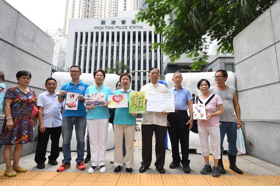 Citizens visit Kwun Tong Police Station to express their support for the police force in Hong Kong, south China, Aug. 10, 2019. (Xinhua/Lui Siu Wai)