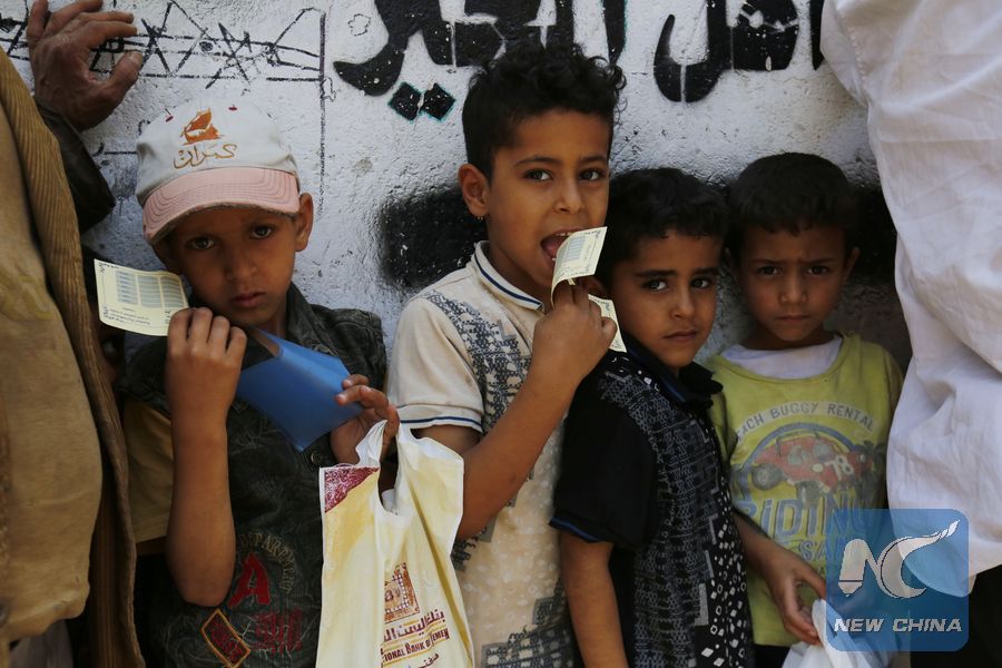 Yemeni war-affected children wait to receive food provided by a charity center in Sanaa, Yemen, on June 18, 2019. (Xinhua/Mohammed Mohammed)