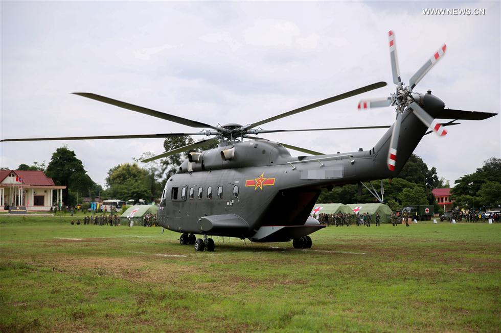 The Chinese People's Liberation Army (PLA)'s Z-8G rescue helicopter participates in the "Peace Train-2019" China-Laos humanitarian and medical joint rescue exercise in the northern suburbs of Lao capital Vientiane, Aug. 18, 2019. It is the first time for the Chinese helicopter to fly abroad to attend a joint health and logistic drill. (Xinhua/Xiong Tianze)