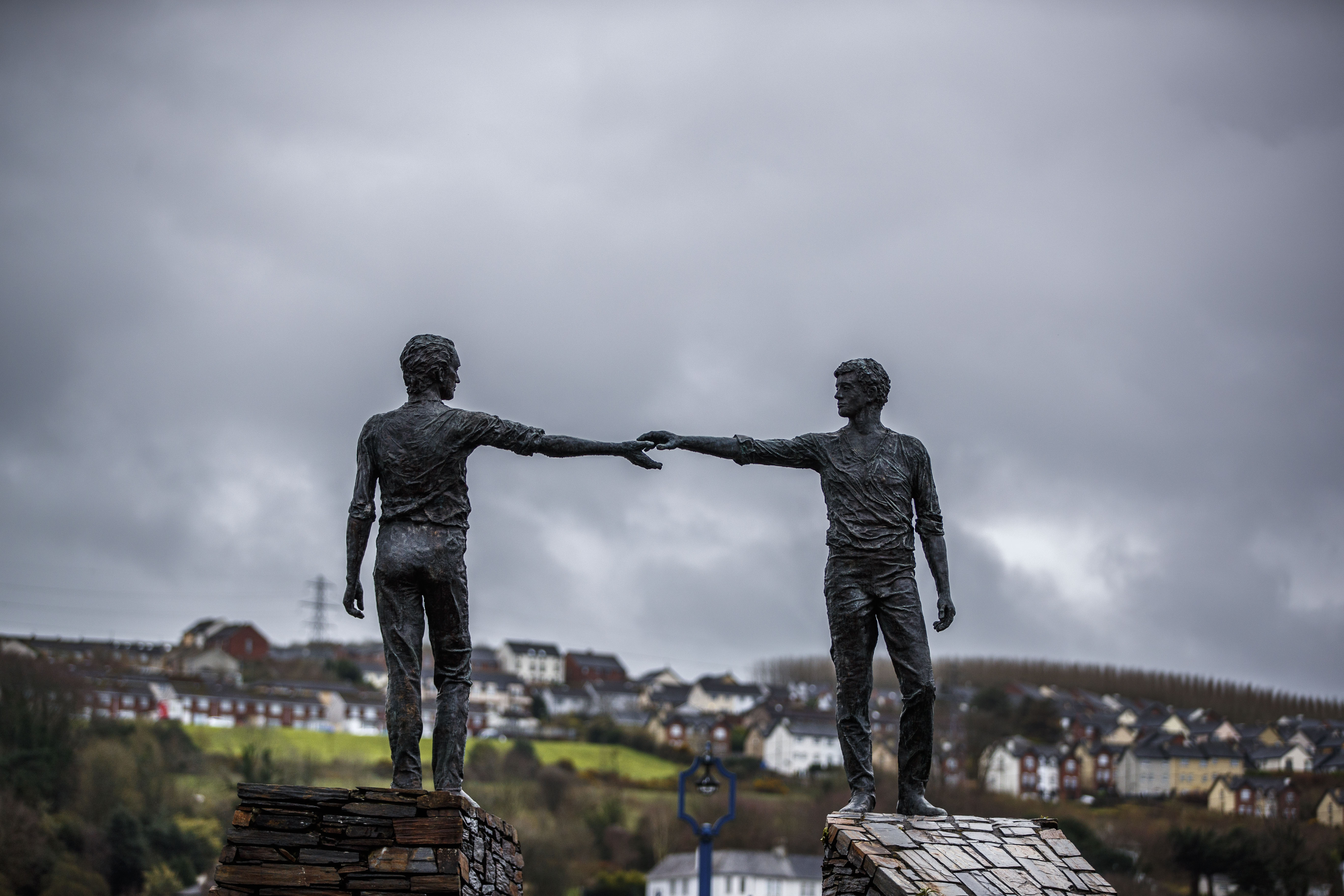Photo taken on March 18, 2019 shows "Hands Across the Divide", a sculpture in Derry, a border city in Northern Ireland, the United Kingdom.(Xinhua/Han Yan)