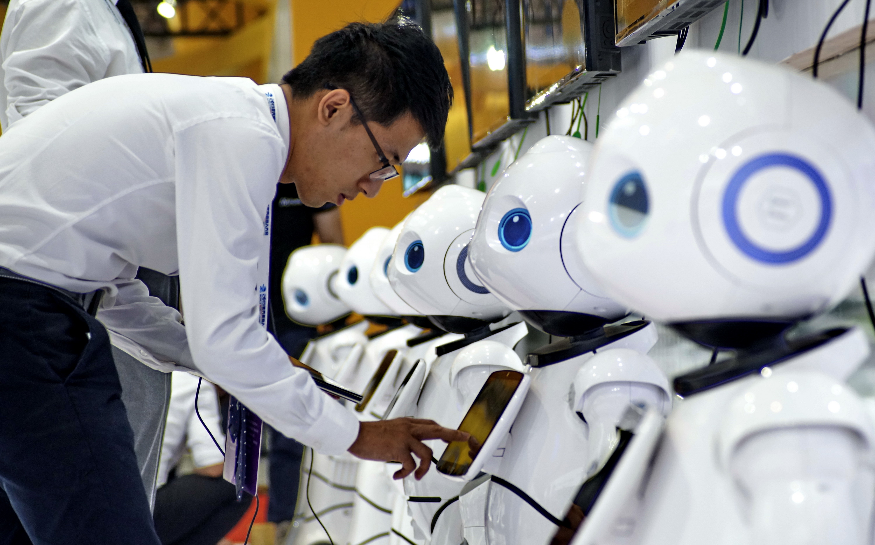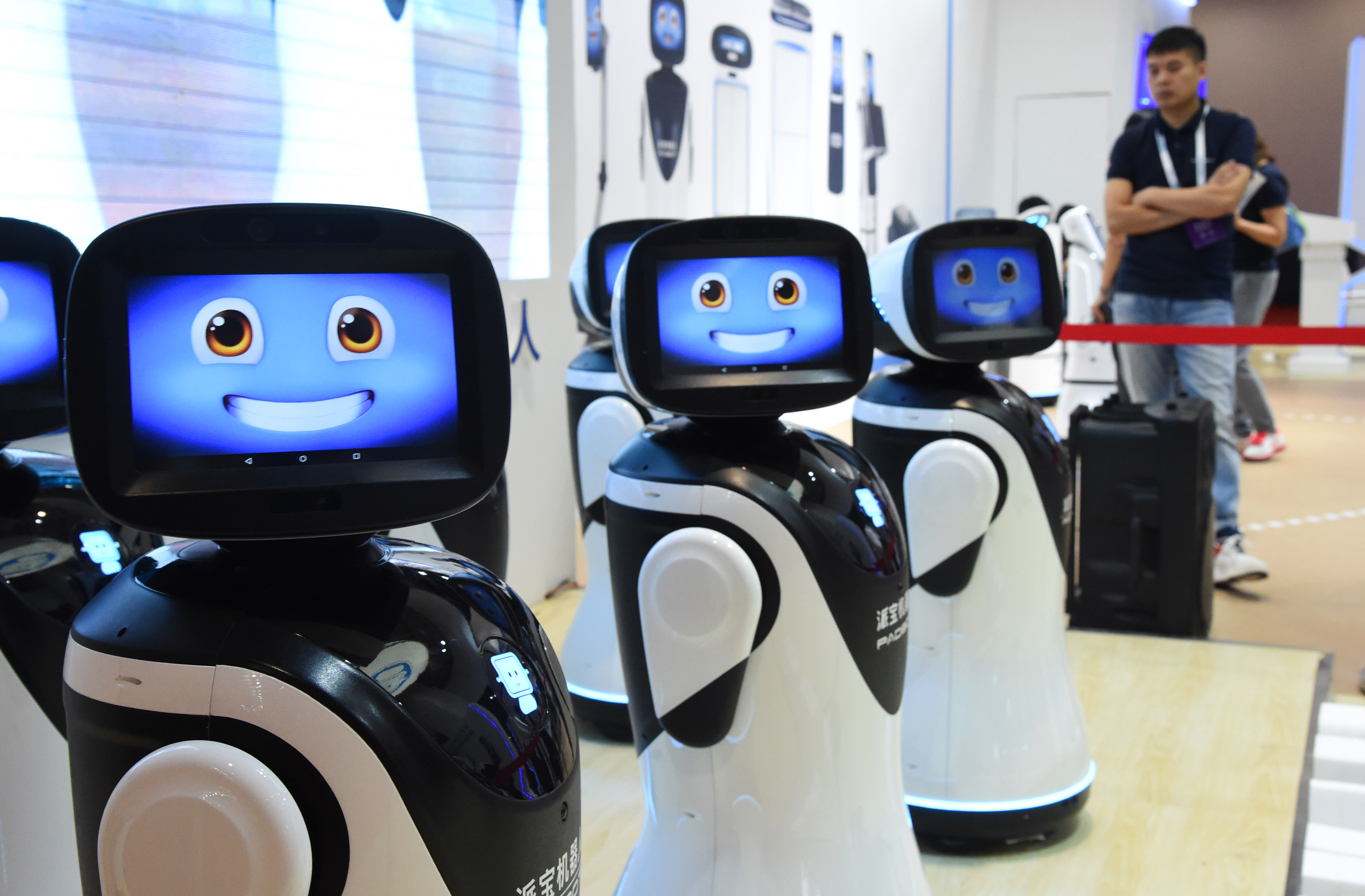 Robotic receptionists at the 2019 World Robot Conference in Daxing District of Beijing. (Xinhua/Ren Chao)
