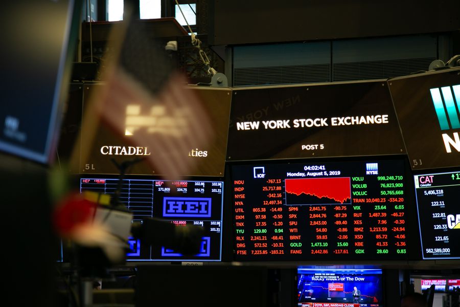 Trading chart is seen on an electronic screen at the New York Stock Exchange in New York, the United States, on Aug. 5, 2019. U.S. stocks plunged as investors worry that U.S. President Donald Trump's threatened new tariffs on Chinese imports will worsen trade prospects. (Xinhua/Guo Peiran)