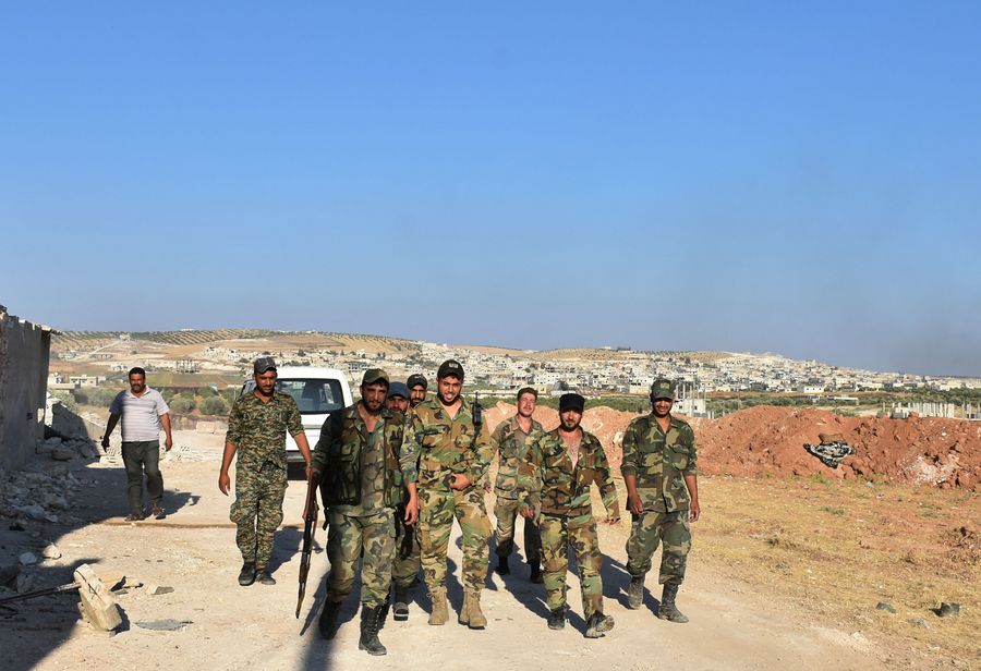 Syrian soldiers are seen in the town of Khan Shaykhun, Idlib, Syria, on Aug. 22, 2019. (Xinhua)