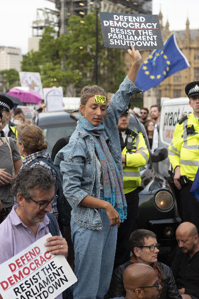 The campaign group, Another Europe is possible, organised a protest against the prorogation of parliament on College Green outside the Houses of Parliament. Some protestors marched along Whitehall to Downing Street.