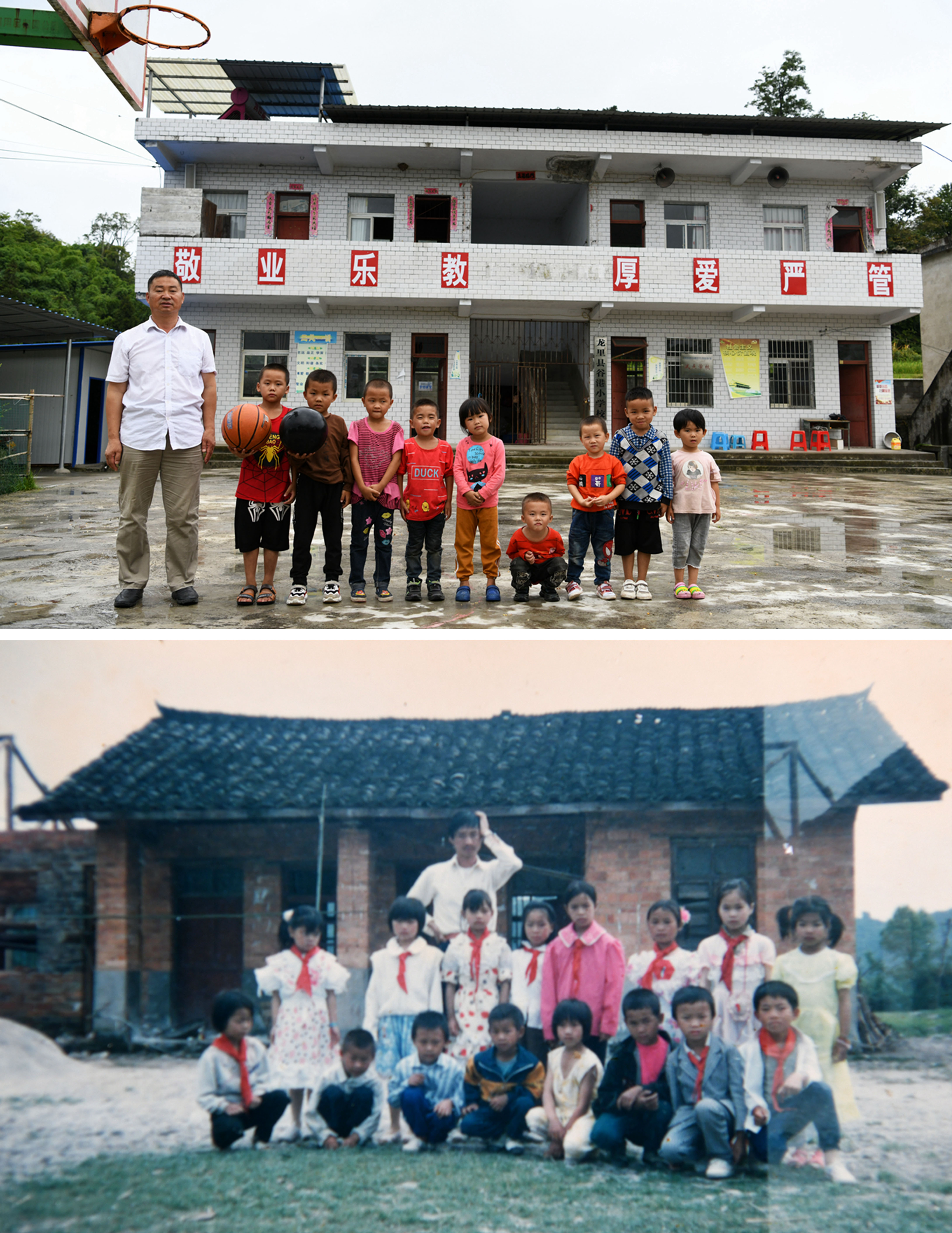 Combo photo shows Wu Guoxian and students posing for a group photo in front of the teaching building at Gugang Primary School in Liuguang Village of Longli County in Bouyei-Miao Autonomous Prefecture of Qiannan, southwest China's Guizhou Province, Aug. 27, 2019 (top, photo by Yang Wenbin), and Wu Guoxian and students posing for a group photo in front of the old classrooms at Gugang Primary School in the 1980s (bottom, copy photo).(Xinhua)