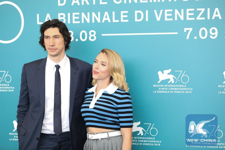 Actress Scarlett Johansson (R) and actor Adam Driver attend a photocall for the film "Marriage Story" during the 76th Venice International Film Festival in Venice, Italy, on Aug. 29, 2019. (Xinhua/Cheng Tingting)