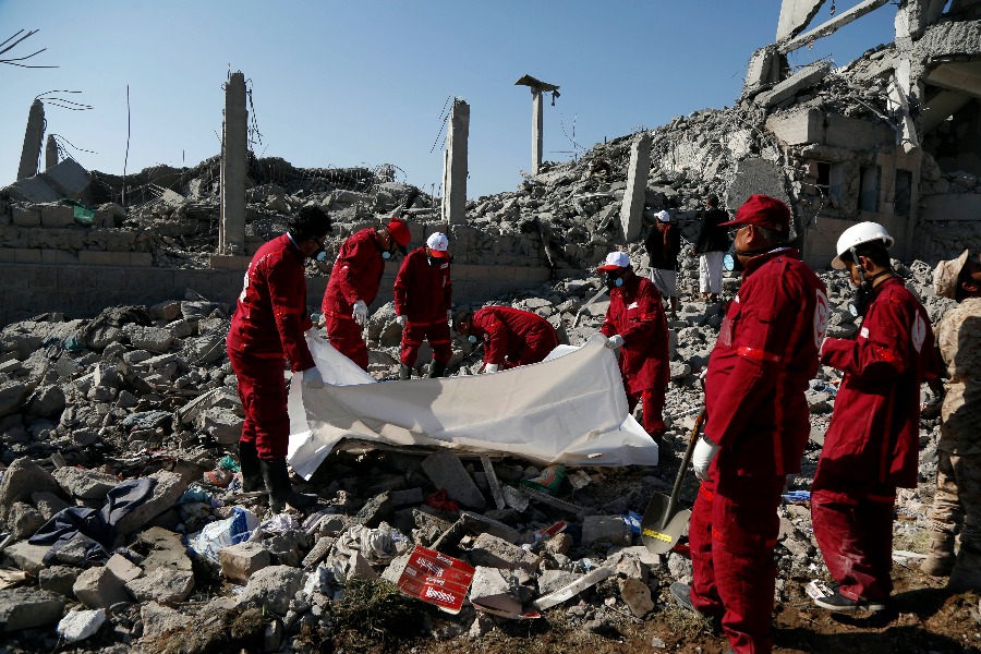 Local Red Crescent medics carry the body of a victim following airstrikes on a prison in central Dhamar province, Yemen, Sept. 1, 2019. (Xinhua/Mohammed Mohammed)