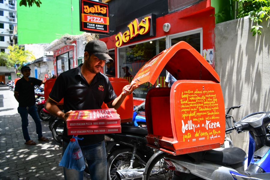 A deliveryman prepares meal orders for customers at a pizza shop in Male, capital of Maldives, Sept. 1, 2019. (Photo by Du Cailiang/Xinhua)
