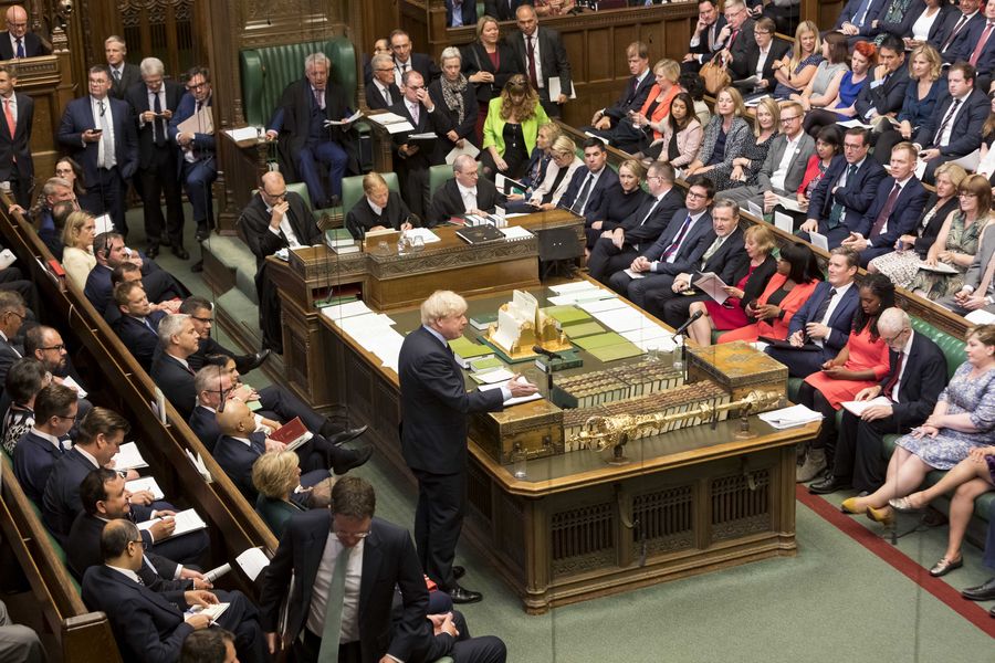 British Prime Minister Boris Johnson (Front) speaks in the House of Commons in London, Britain, on Sept. 3, 2019. (Jessica Taylor/UK Parliament/Handout via Xinhua)