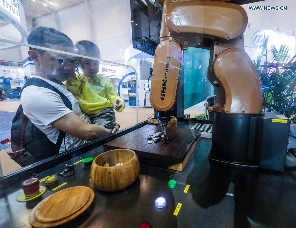 Visitors look at a robot playing chess at the 9th China Smart City and Intelligent Economy Expo in Ningbo, east China's Zhejiang Province, Sept. 6, 2019. Unveiled here on Friday, the 9th China Smart City and Intelligent Economy Expo showcases latest products and technologies in the area. (Xinhua/Xu Yu)