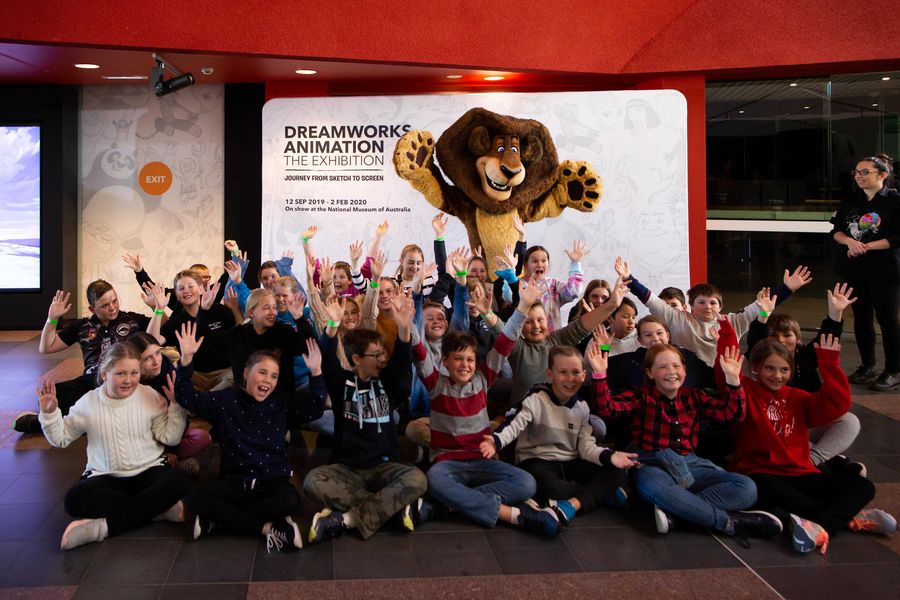 Teachers and students from local schools and other visitors pose for photos at an exhibition on DreamWorks Animation in the National Museum of Australia (NMA) in Canberra, Australia, Sept. 11, 2019. (Xinhua/Liang Tianzhou)