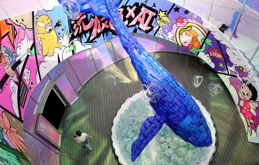 A whale sculpture made of plastic waste is displayed during the preview of the 2019 World Artificial Intelligence Conference in east China's Shanghai, Aug. 26, 2019. (Xinhua/Fang Zhe)