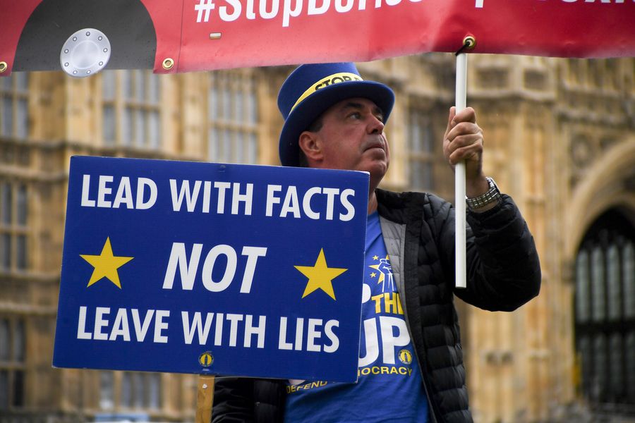 A demonstrator stands outside the Houses of Parliament holding placards in London, Britain, on Sept. 9, 2019. (Photo by Alberto Pezzali/Xinhua)