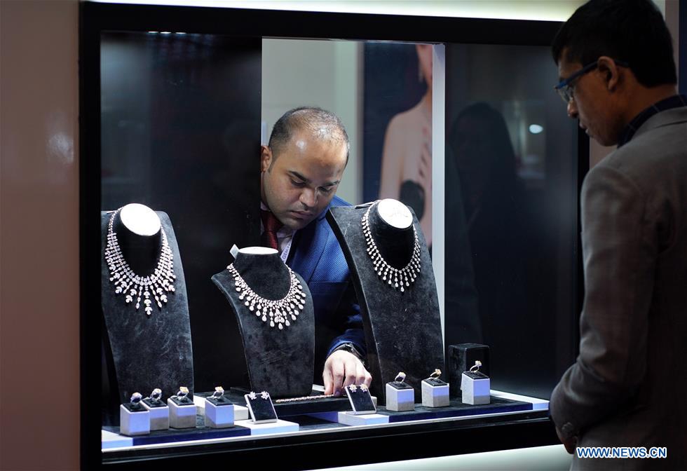 An exhibitor arranges jewellery at the September Hong Kong Jewellery & Gem Fair in south China's Hong Kong, Sept. 19, 2019. The fair held from Sept. 18 to 22 at Hong Kong Convention & Exhibition Center has attracted over 3,700 exhibitors from around the world. (Xinhua/Qin Qing)