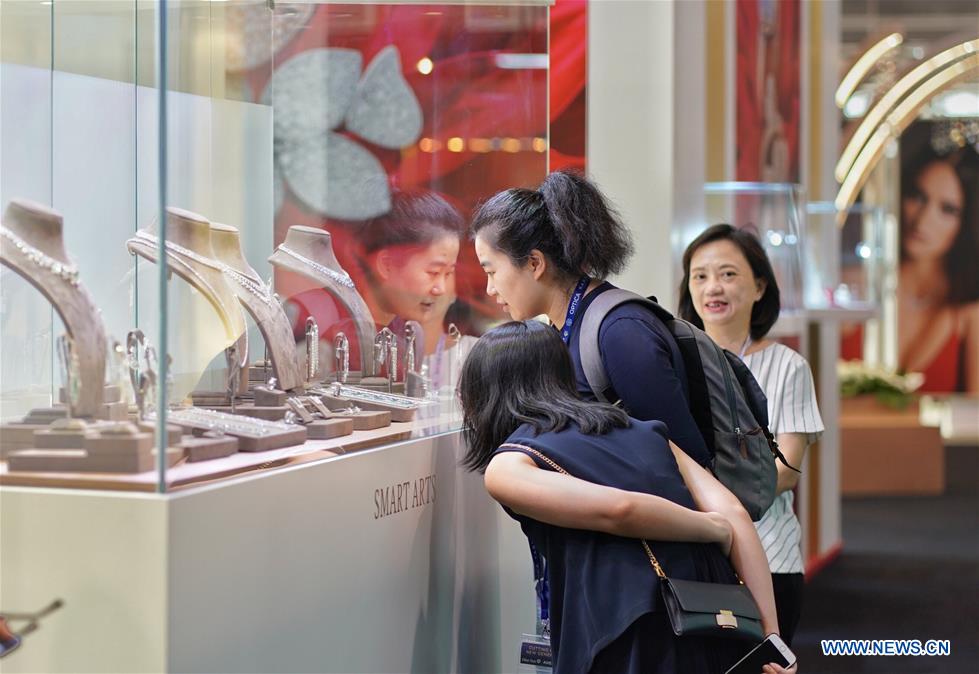Visitors look at jewellery exhibited at the September Hong Kong Jewellery & Gem Fair in south China's Hong Kong, Sept. 19, 2019. The fair held from Sept. 18 to 22 at Hong Kong Convention & Exhibition Center has attracted over 3,700 exhibitors from around the world. (Xinhua/Qin Qing)