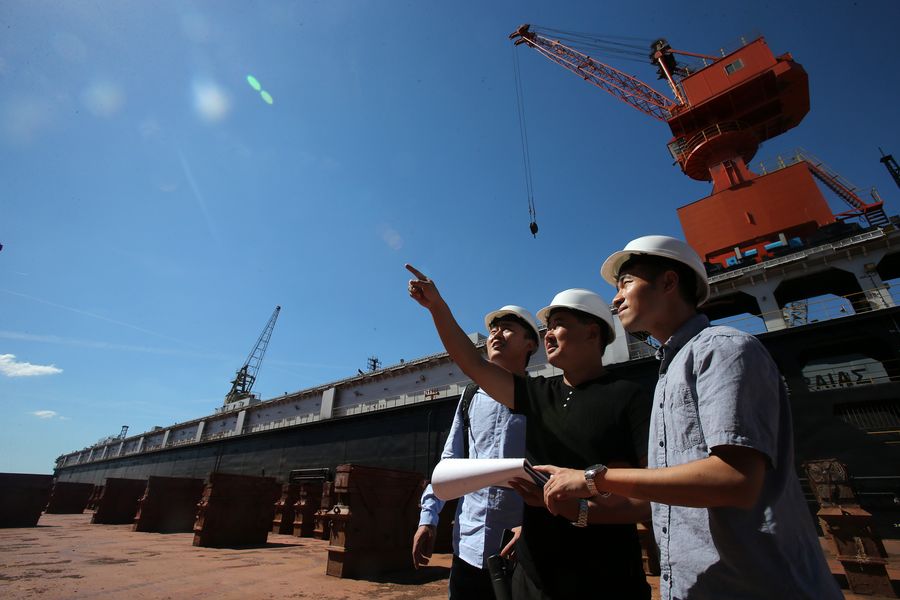 Chinese employees work at the shipyard of Piraeus Port Authority (PPA) in Perama, Greece, on Sept. 21, 2018.(Xinhua/Marios Lolos)
