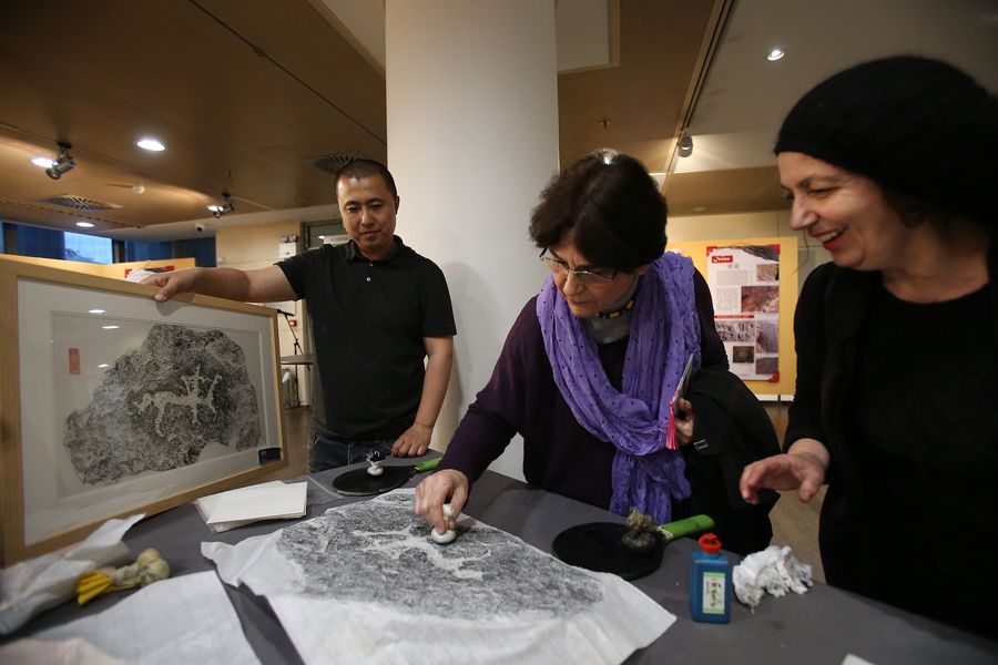 A visitor (C) learns the art of rubbing during the Yinshan Rock Carving Art exhibition in Athens, Greece on April 11, 2019.(Xinhua/Marios Lolos)