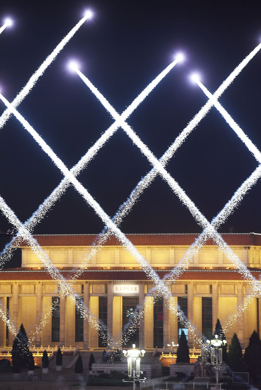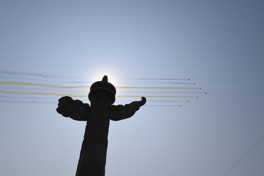 An air echelon flies over the Tian'anmen Square during the celebrations marking the 70th anniversary of the founding of the People's Republic of China (PRC) in Beijing, capital of China, Oct. 1, 2019. (Xinhua/Jin Liangkuai)