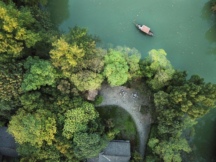 In this aerial photo taken on Oct. 29, 2018, a tourist boat sails in the Xixi Wetland in Hangzhou, capital of Zhejiang Province. (Xinhua/Weng Xinyang)
