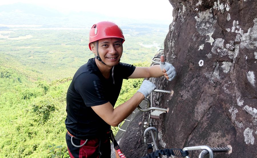 A tourist poses for a photo while trying rock climbing at Hainan Baishiling Tourism Scenic Area during the National Day holiday in Qionghai, south China's Hainan Province, Oct. 6, 2019. (Xinhua/Zhao Yingquan)