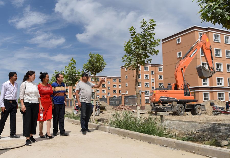 Local residents visit their new home at a relocation site in Yecheng County in Kashgar, northwest China's Xinjiang Uygur Autonomous Region, Aug. 19, 2019. (Xinhua/Ding Lei)