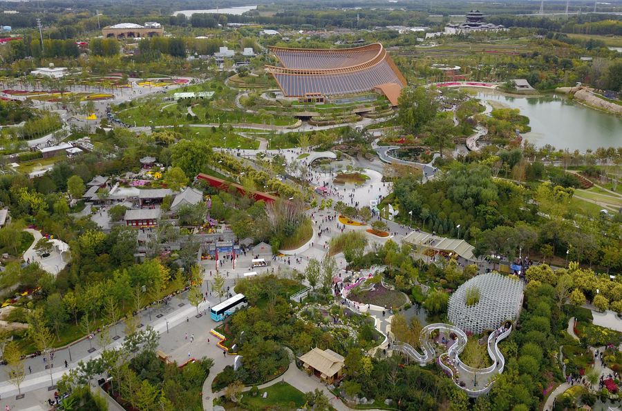 Aerial photo taken on Oct. 6, 2019 shows a view of the International Horticultural Exhibition in Yanqing District of Beijing, capital of China. (Xinhua/Zhang Chenlin)