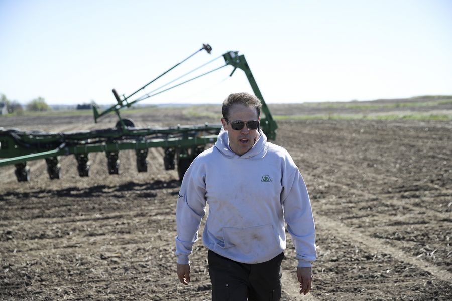 Grant Kimberley, a sixth-generation soybean farmer and marketing director of the Iowa Soybean Association, walks on a field of his family farm in Maxwell, Iowa, the United States, April 26, 2019. (Xinhua/Wang Ying)