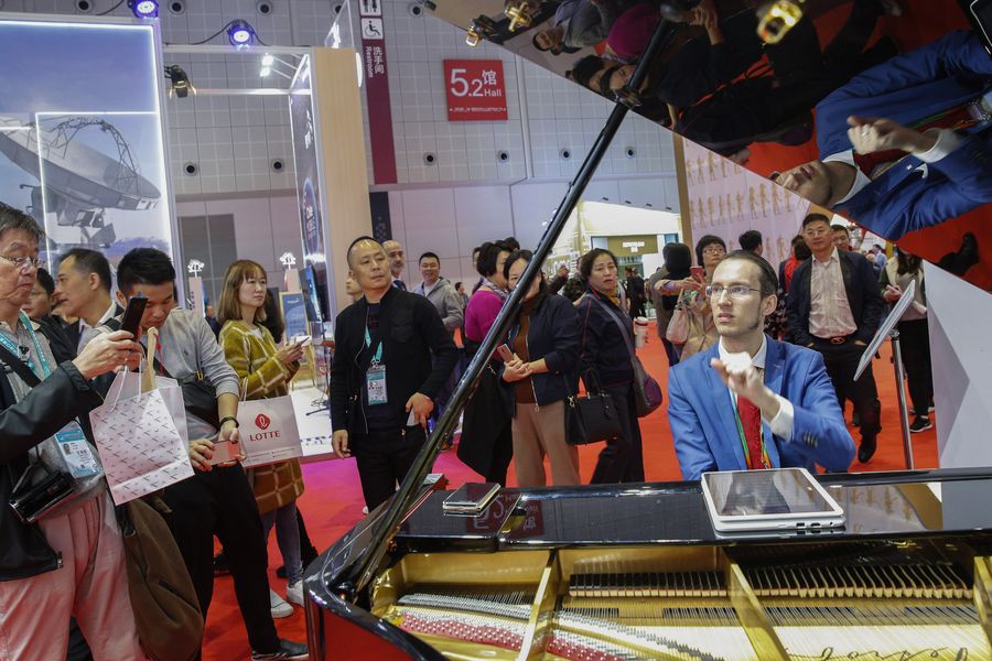A staff member plays the piano at the booth of the Czech Republic at the first China International Import Expo (CIIE) in Shanghai, east China, Nov. 9, 2018. (Xinhua/Zhang Yuwei)