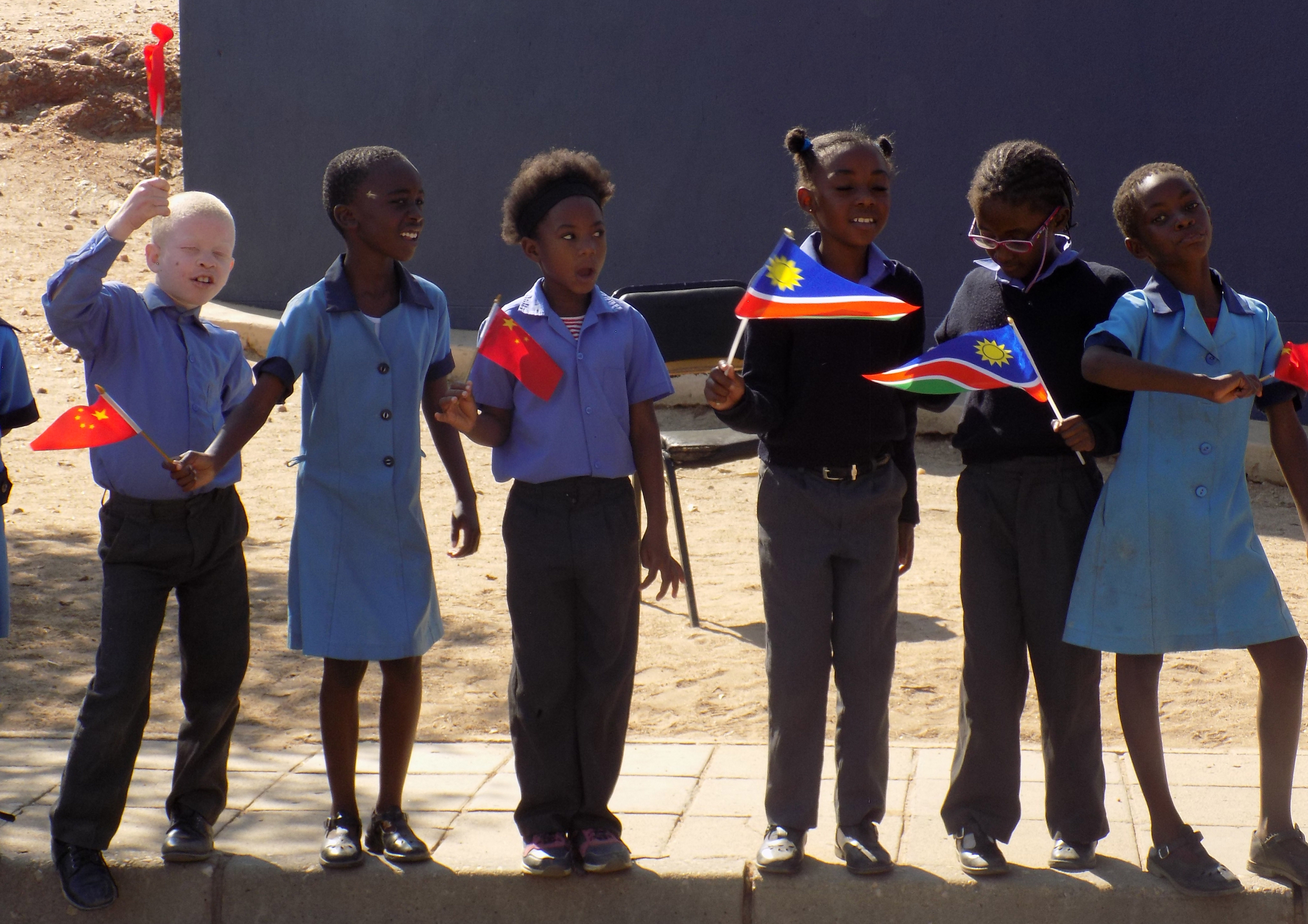 Students wave flags prior to the launching ceremony of the Panda Pack Project at Tobias Hainyeko Primary School in Windhoek, Namibia, Sept. 24, 2019. (Photo by Musa C Kaseke/Xinhua)
