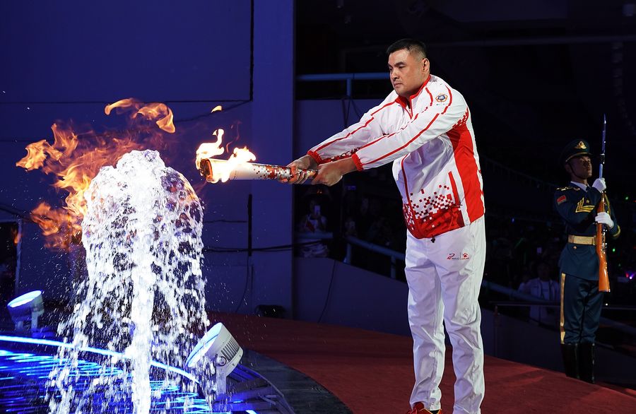 At the end of the opening ceremony that lasted for about two and a half hours, six bearers relayed the torch before retired basketball player Liu Yudong, China's flag bearer at the 1996 and 2000 Summer Olympics, lit the cauldron.