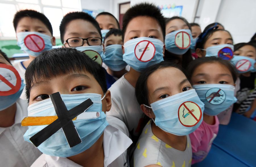 File photo shows children wear masks with self-made no-smoking signs in Handan City, north China's Hebei Province. (Xinhua/Hao Qunying)