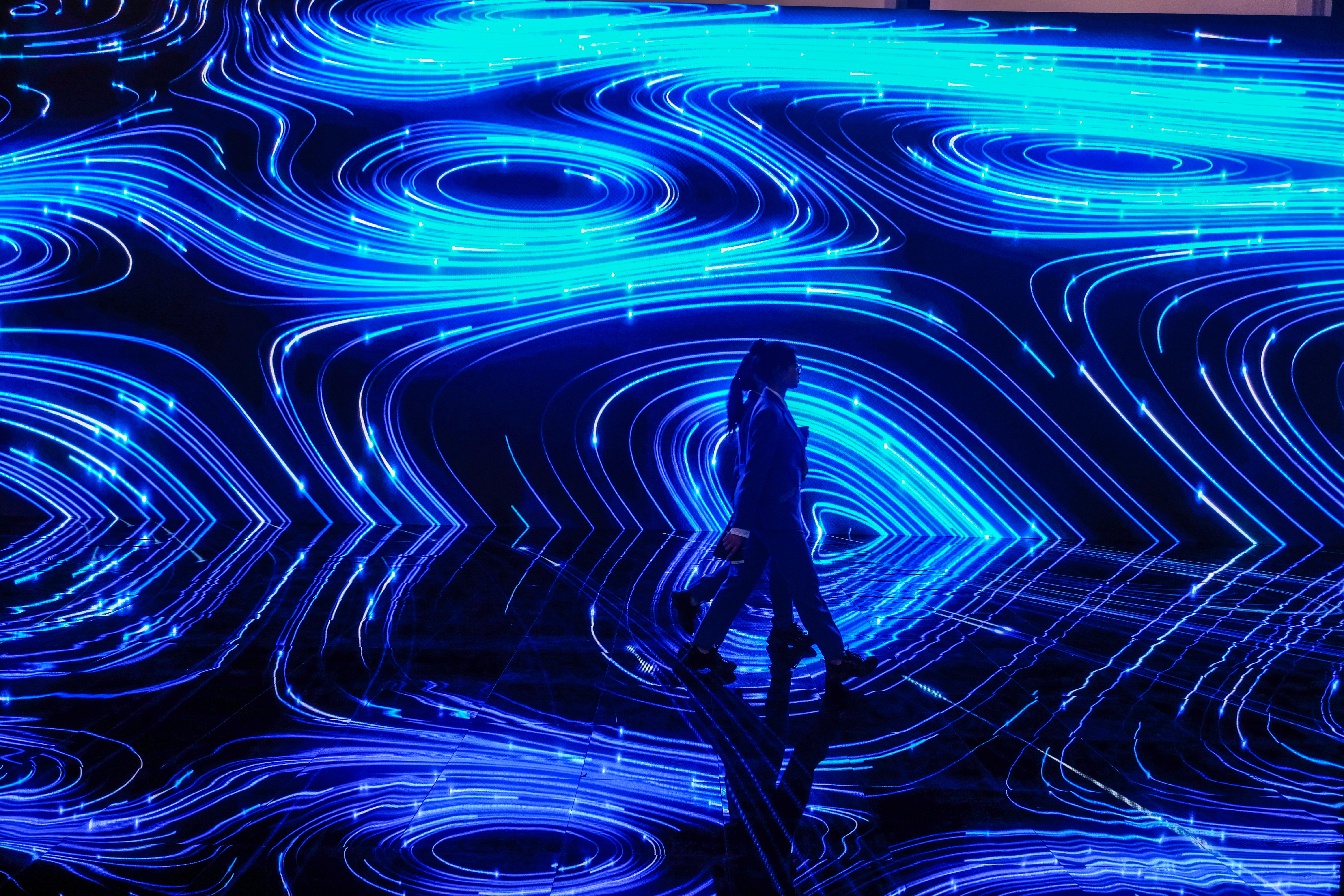 People walk before a screen in the Wuzhen International Internet Exhibition and Convention Center in the river town of Wuzhen, east China's Zhejiang Province, Oct. 19, 2019. (Xinhua/Xu Yu)