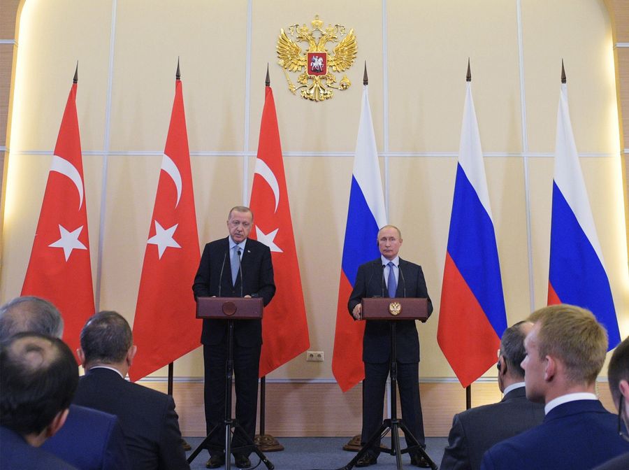 Russian President Vladimir Putin (R, Rear) and Turkish President Recep Tayyip Erdogan (L, Rear) attend a joint news conference following their meeting in Sochi, Russia, on Oct. 22, 2019. (Sputnik via Xinhua)