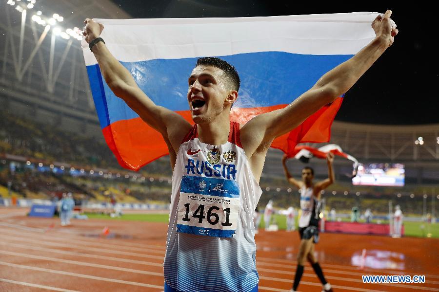 Gold medalist Ilia Ivaniuk of Russia celebrates after the men's high jump of track and field at the 7th CISM Military World Games in Wuhan, capital of central China's Hubei Province, Oct. 22, 2019.