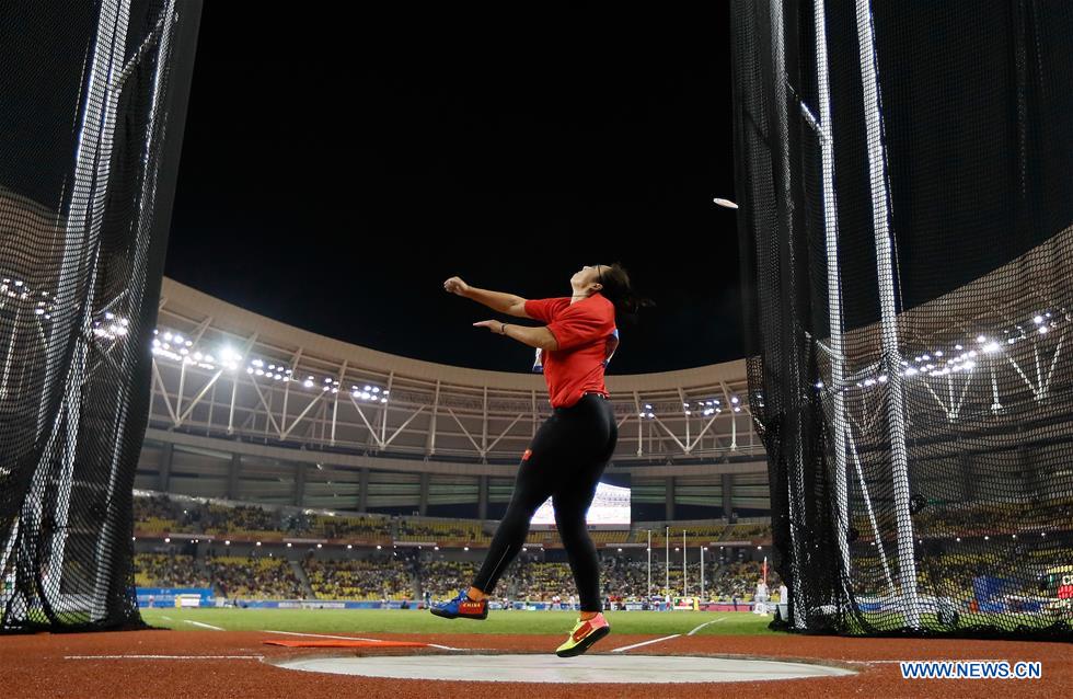 Feng Bin of China competes during the women's discus throw final of track and field at the 7th CISM Military World Games in Wuhan, capital of central China's Hubei Province, Oct. 24, 2019. (Xinhua/Wang Lili)