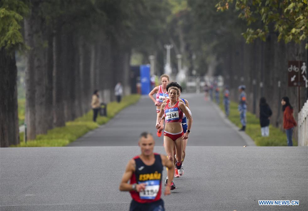 Athletes compete during the marathon of track and field at the 7th CISM Military World Games in Wuhan, capital of central China's Hubei Province, Oct. 27, 2019. (Xinhua/Hu Huhu)