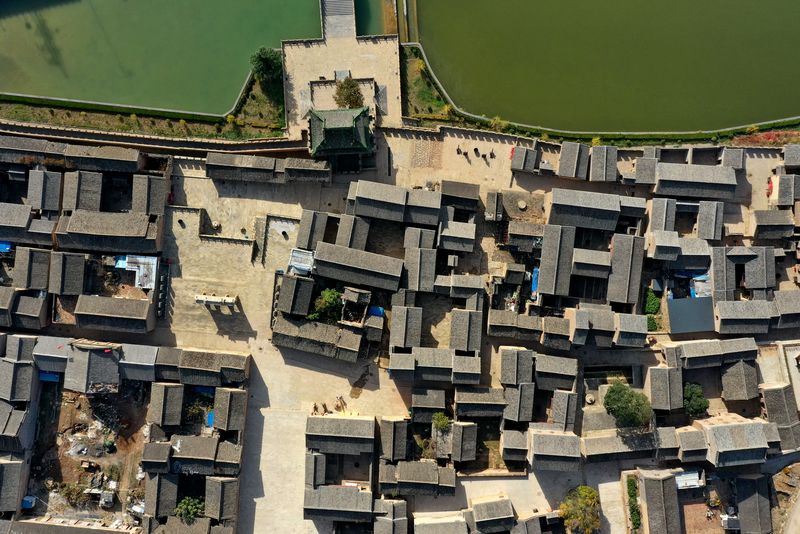 Aerial photo taken on Oct. 30, 2019 shows the Xiangyu Castle in Qinshui County, north China's Shanxi Province. The Xiangyu Castle that was built in the Ming Dynasty (1368-1644), has attracted many tourists with its beautiful moat, unique walls and courtyards. (Xinhua/Cao Yang)