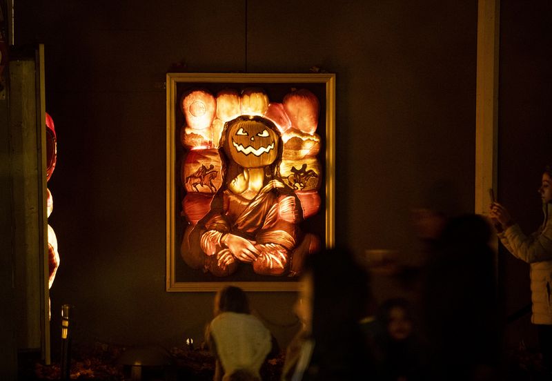 Visitors view the illuminated Jack O'Lanterns at the Great Jack O'Lantern Blaze held at Croton-on-Hudson of New York State, the United States, Oct. 29, 2019. More than 7,000 illuminated Jack O'Lanterns, all designed and hand-carved by artisans, are on display during the show, which is expected to attract more than 180,000 visitors this year. (Xinhua/Wang Ying)
