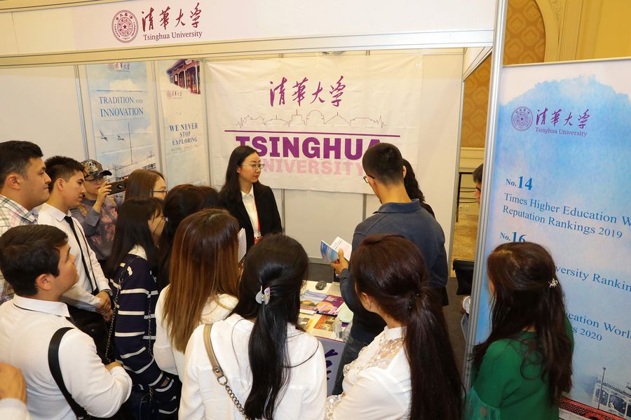 Uzbek students communicate with a delegation of China's higher educational institution at an exhibition on higher education in China, in Tashkent, Uzbekistan, Oct. 8, 2019. (Photo by Zafar Khalilov/Xinhua)