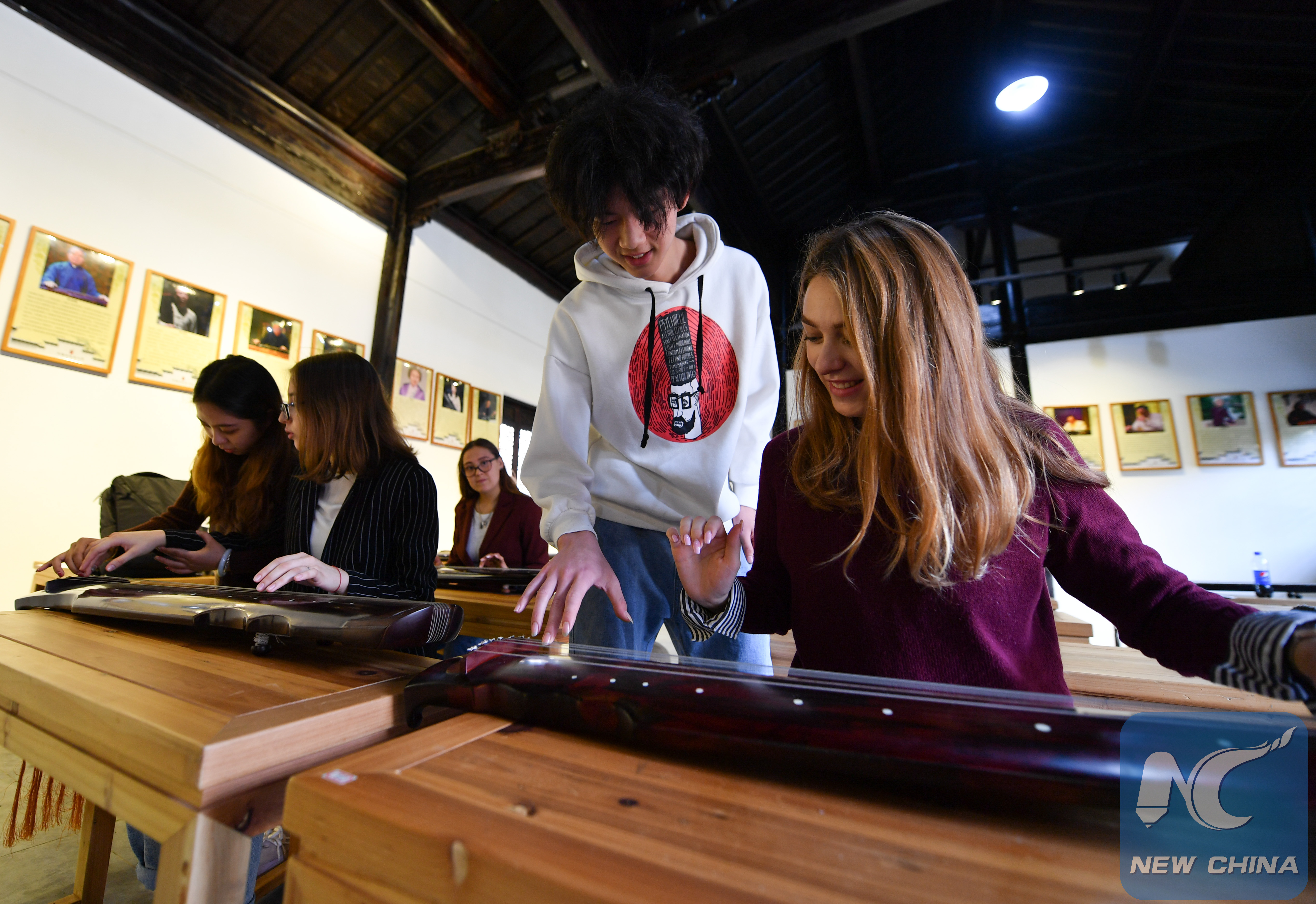 Melchakova Nataliia (1st R) learns Guqin, a seven-string traditional Chinese musical instrument, at East China Jiaotong University in Nanchang, east China's Jiangxi Province, Oct. 31, 2019. (Xinhua/Hu Chenhuan)