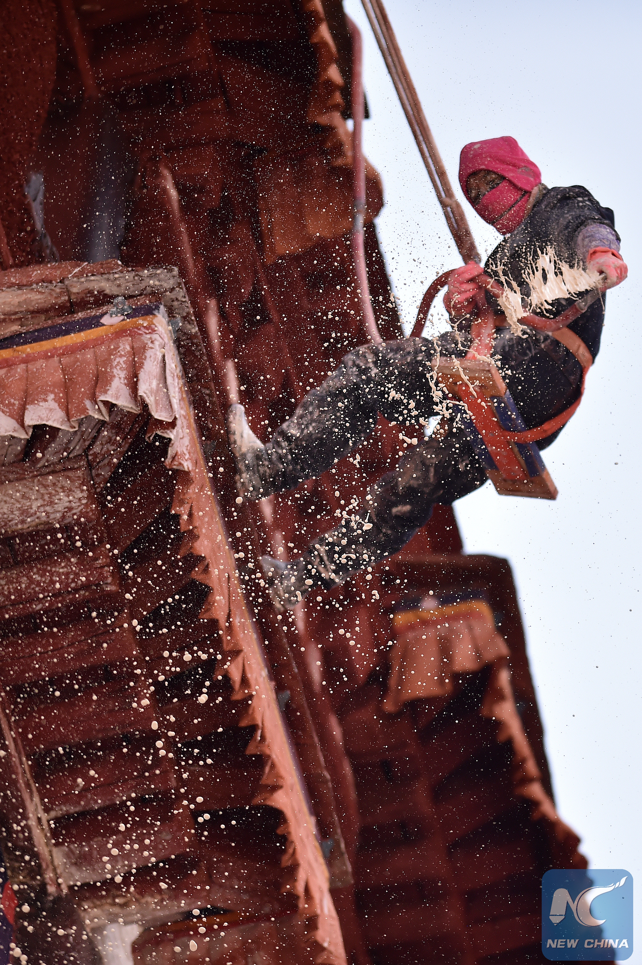 A worker paints the wall of the Potala Palace during an annual renovation of the ancient architectural complex in Lhasa, capital of southwest China's Tibet Autonomous Region, Nov. 1, 2019. (Xinhua/Chogo)