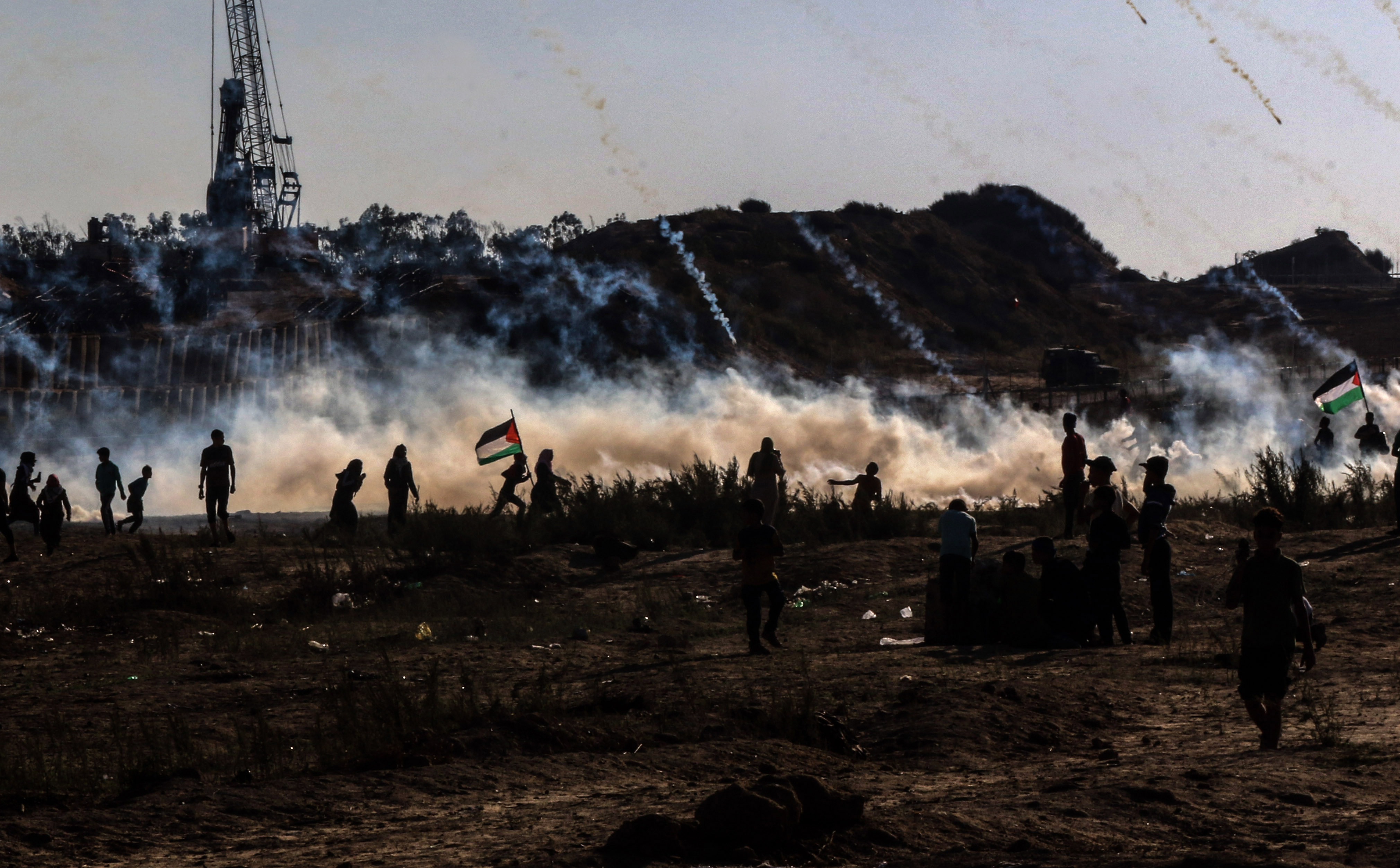 Palestinian protesters run to take cover from tear gas canisters fired by Israeli troops during clashes on the Gaza-Israel border, east of al-Bureij refugee camp in central Gaza Strip, Nov. 1, 2019. (Photo by Yasser Qudih/Xinhua)