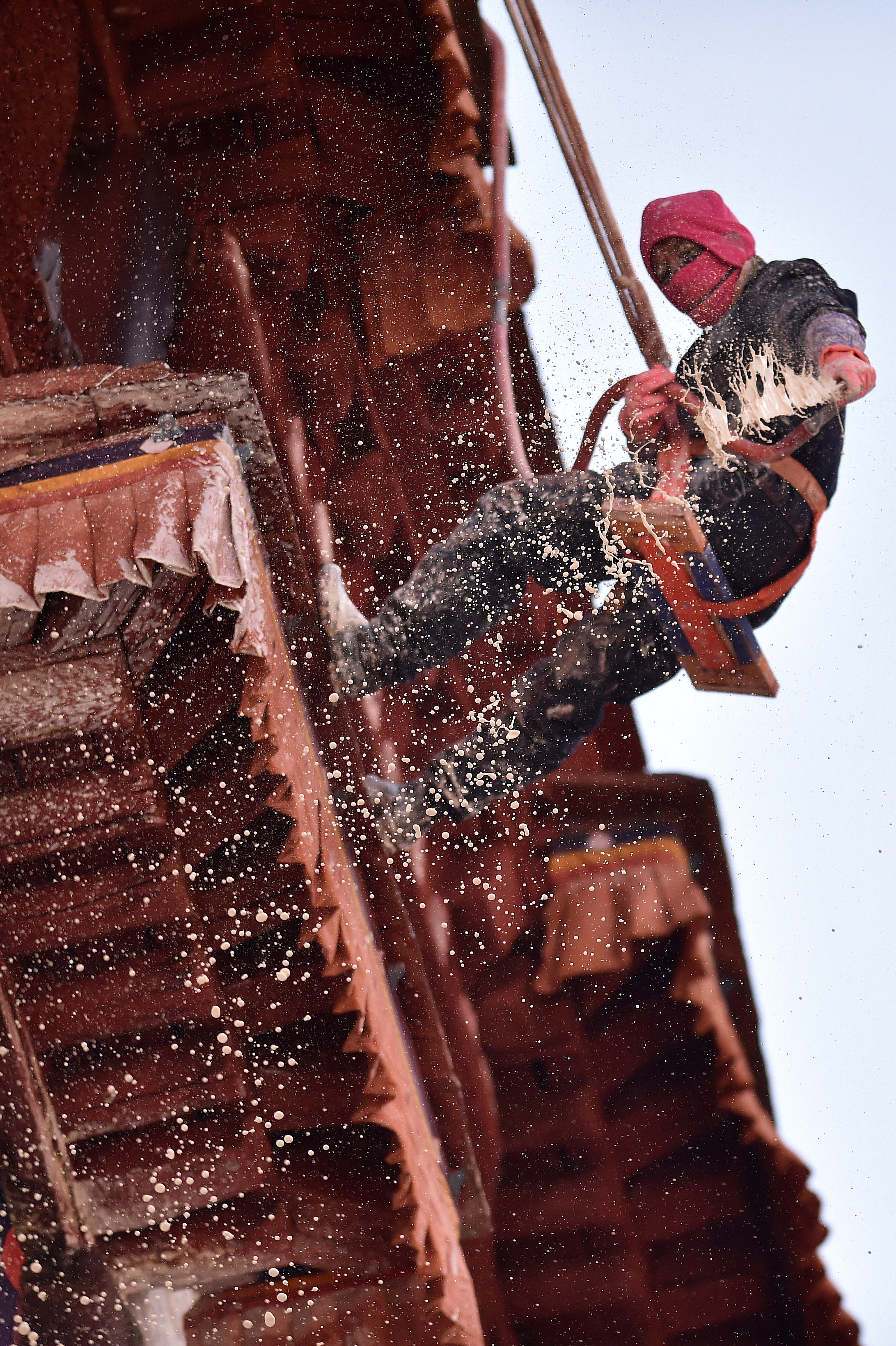 A worker paints the wall of the Potala Palace during an annual renovation of the ancient architectural complex in Lhasa, capital of southwest China's Tibet Autonomous Region, Nov. 1, 2019. (Xinhua/Chogo)