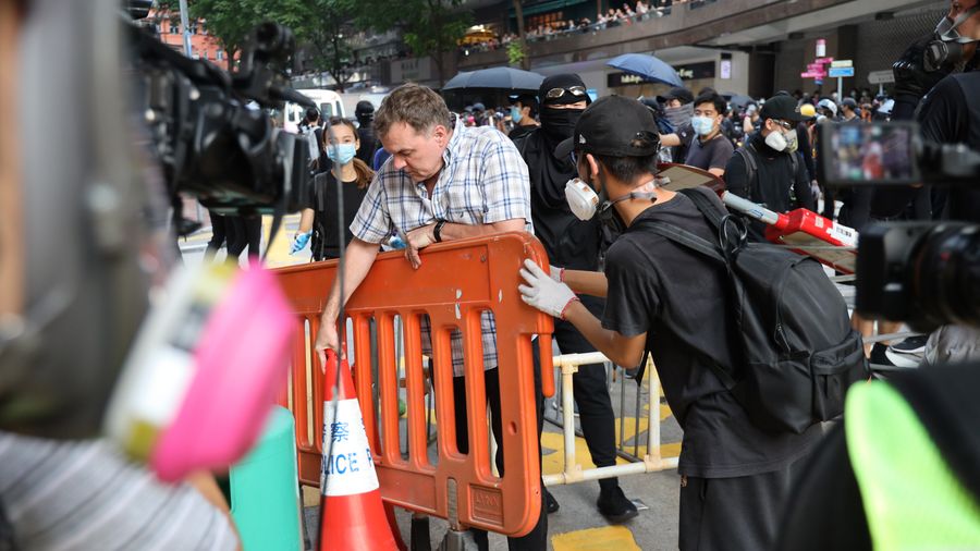 A man clears barricades at Queen's Road East in Hong Kong, south China, Nov. 2, 2019. Black-clad illegal protesters blocked roads and disrupted traffic at Queen's Road East on Saturday. A man braved the illegal protesters to clear the barricades out of the road. (Xinhua)