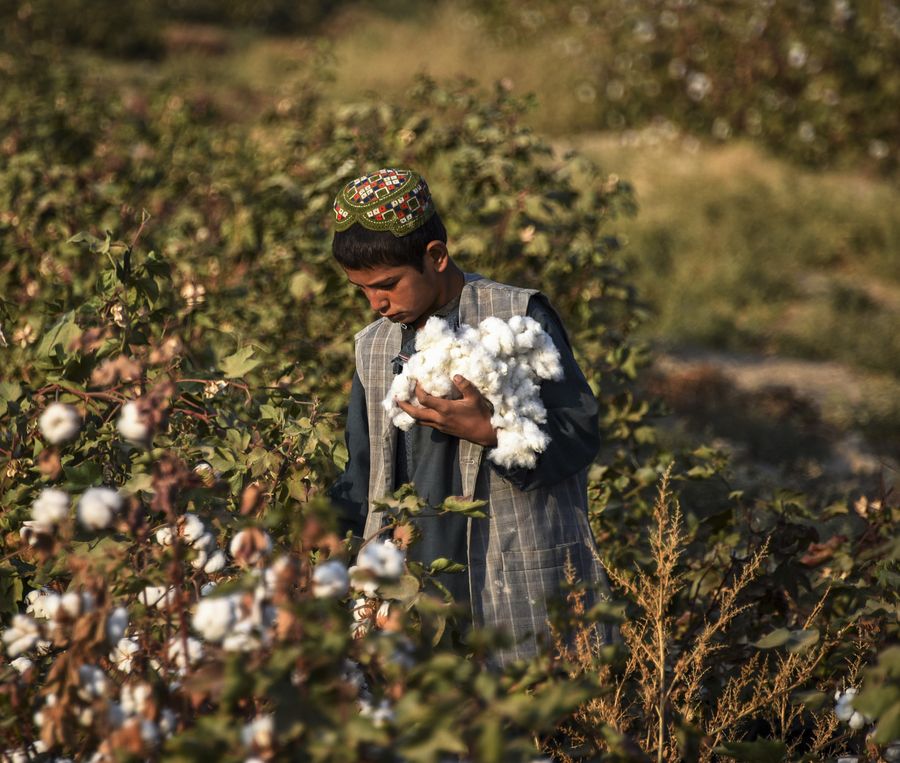 A child harvests cotton in Daman district of Kandahar province, Afghanistan, Oct. 27, 2019. In Afghanistan's Kandahar province where many farmers still highly depend on poppy opium to earn a living, some farmers revive hundreds of acres of fields after long years, to plant cotton instead of the illicit crop. (Photo by Sanaullah Seiam/Xinhua)