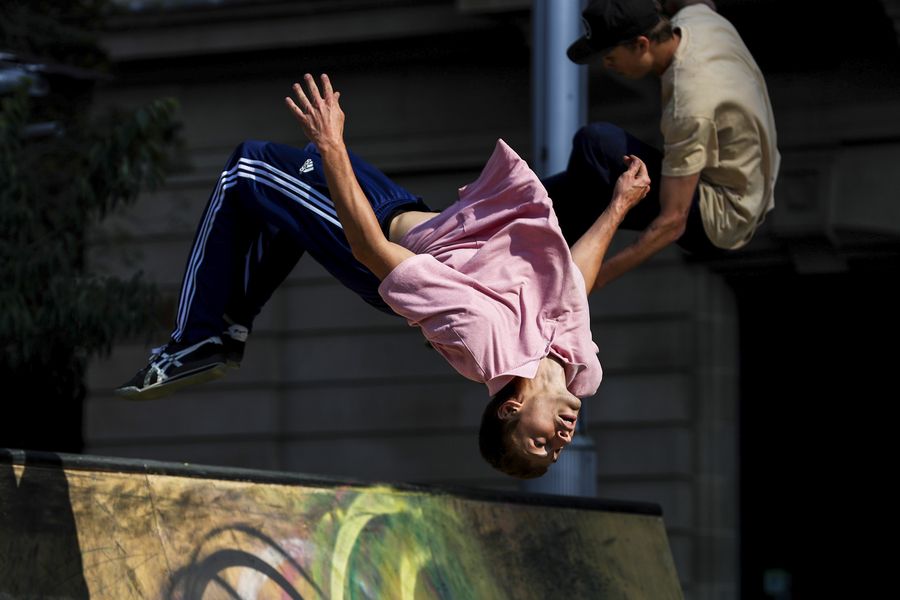 A participant performs parkour for Sydney's Art & About Sydney program in Sydney, Australia, Nov. 2, 2019. (Xinhua/Bai Xuefei)