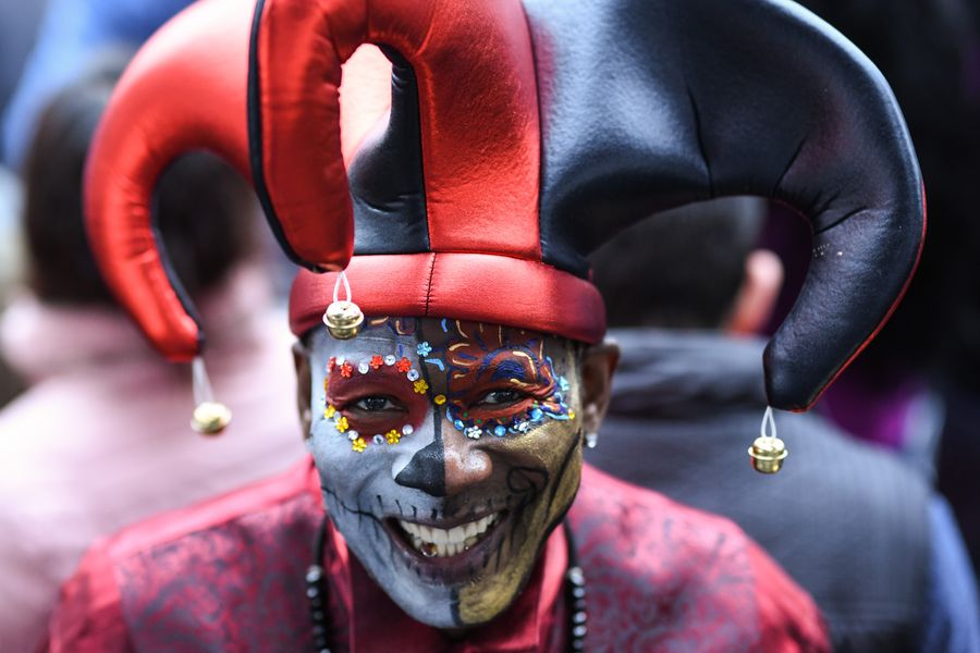 A man takes part in the Day of the Dead Parade in downtown Mexico City, capital of Mexico, on Nov. 2, 2019. Thousands of Mexicans attended the parade on Saturday. (Xinhua/Xin Yuewei)