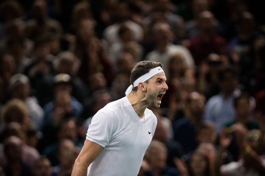 Grigor Dimitrov of Bulgaria celebrates after the singles quarter-final match against Cristian Garin of Chile at the Rolex Paris Masters 1000 held at the AccorHotels Arena in Paris, France, Nov. 1, 2019. (Photo by Aurelien Morissard/Xinhua)