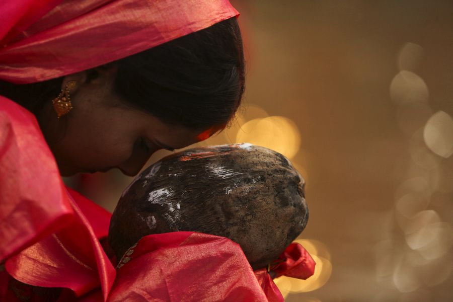 A Nepalese devotee performs ritual prayers during Chhath Festival in a river bank in Kathmandu, Nepal, on Nov. 2, 2019. The Chhath festival is dedicated to the sun, which is regarded as a token of stability and prosperity, and a Vedic goddess "Chhathi Maiya." (Photo by Sulav Shrestha/Xinhua)