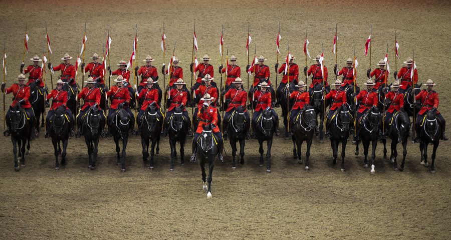 Members of the Royal Canadian Mounted Police (RCMP) perform during the RCMP Musical Ride at the 2019 Royal Agricultural Winter Fair in Toronto, Canada, on Nov. 2, 2019. (Photo by Zou Zheng/Xinhua)